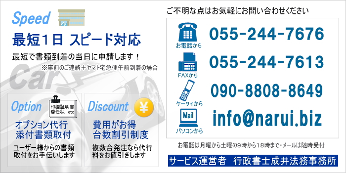 | 行政書士成井法務事務所が運営。山梨県の車庫証明取得代行サイト |